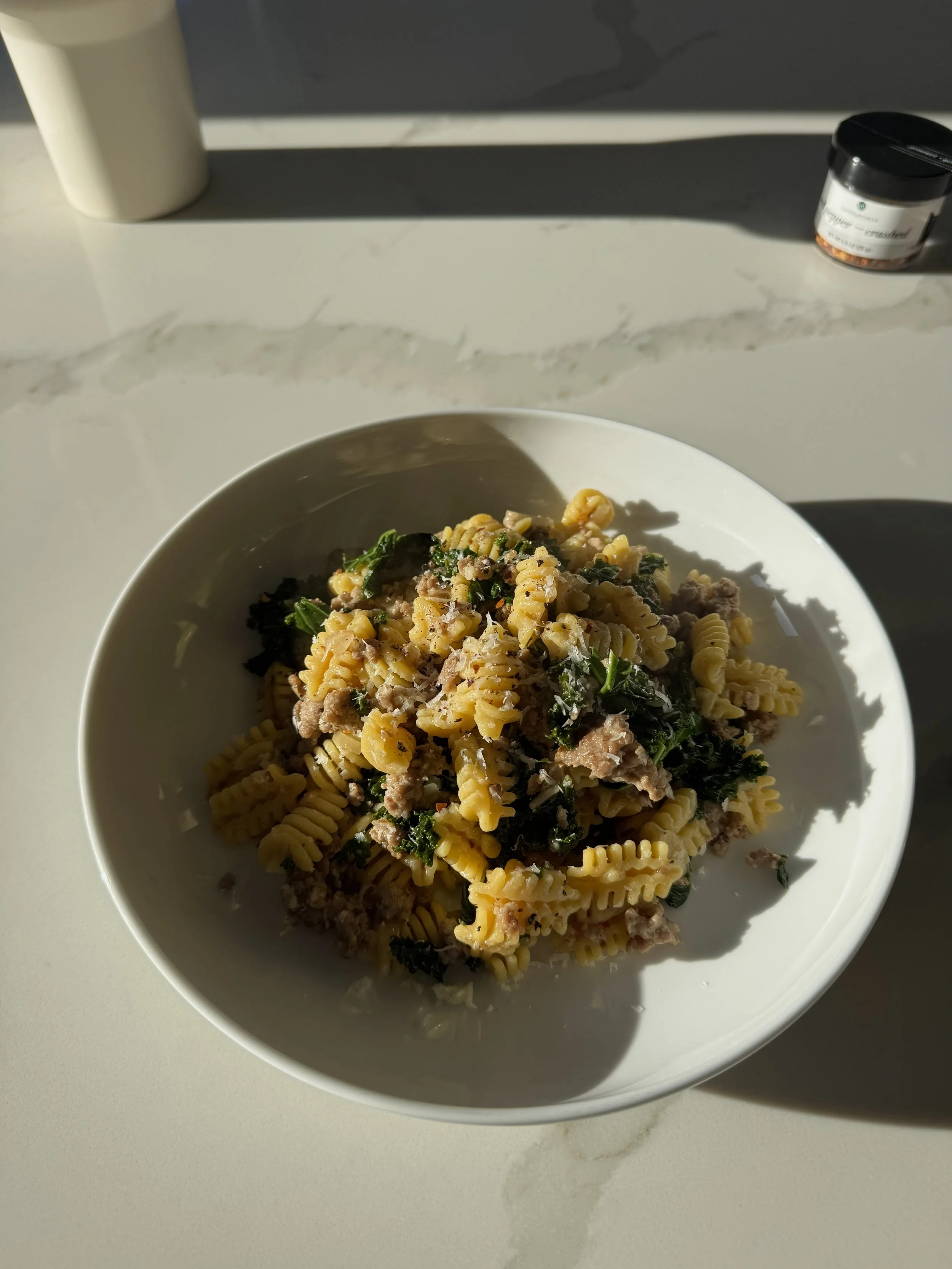 Add in the spinach or kale (if using). Toss until the spinach has wilted, then add in the drained pasta.