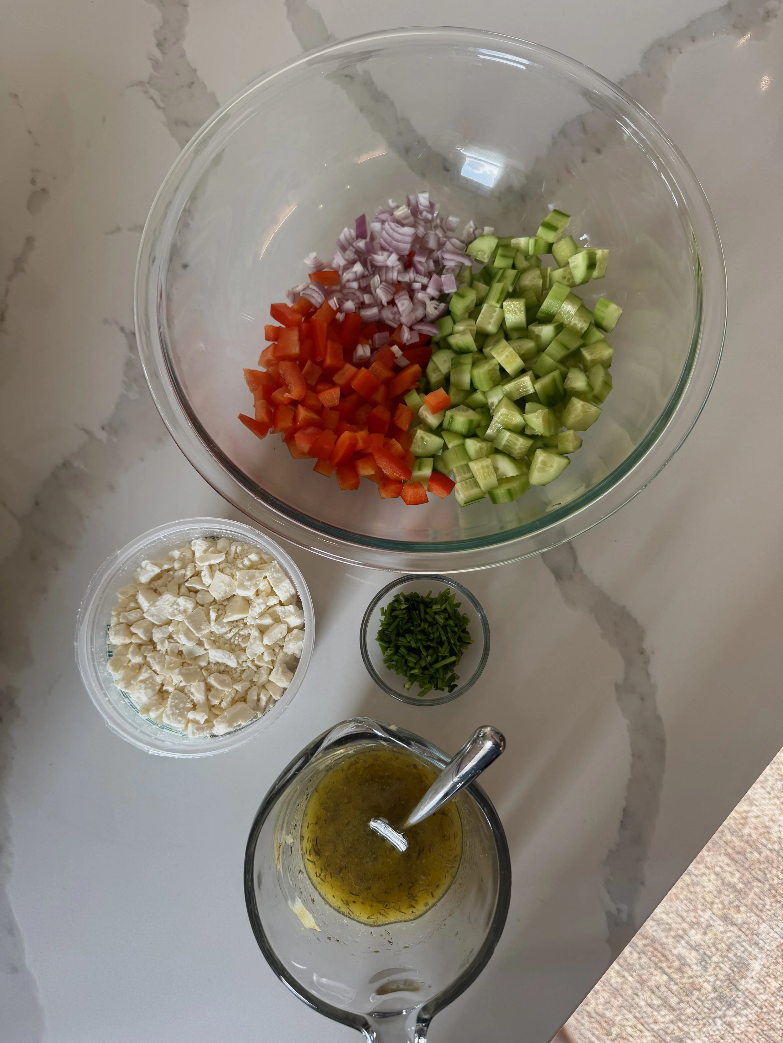 Dice raw veggies (cucumbers, bell pepper, shallot)